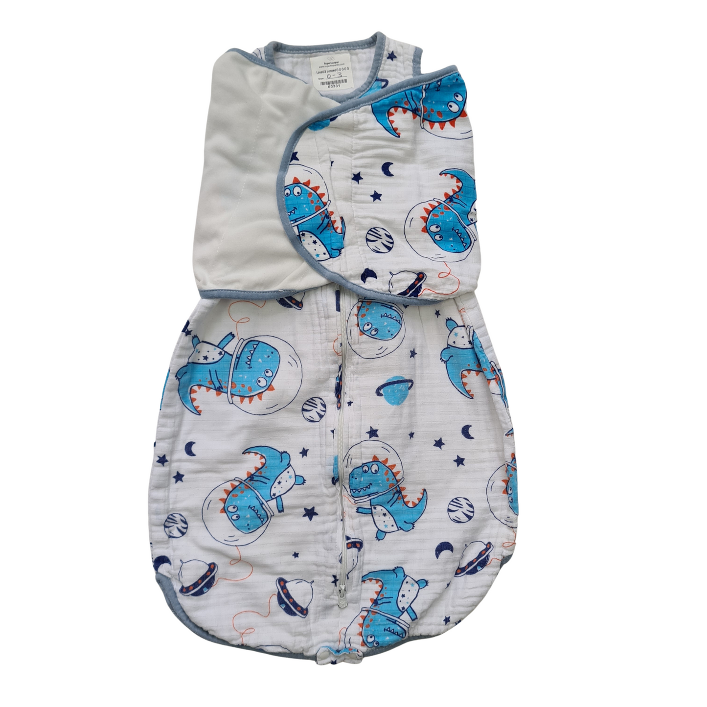 Zip up front sleep bag with dinosaurs in space design.